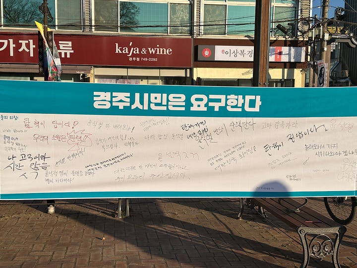 As I walked, soaking in the calm yet historic vibes of the town, a faint noise caught my curiosity from afar. The closer I got, the more the scene began to unfold—hey some police cars and its officers were on duty, then a small group of people sitting on the ground, holding blue-red posters covered in Hangul. I couldn’t read the text, but the scene felt charged with purpose, like something important was happening. What I did was using my Google Translate lens to translate whatever words that appeared in front of me.