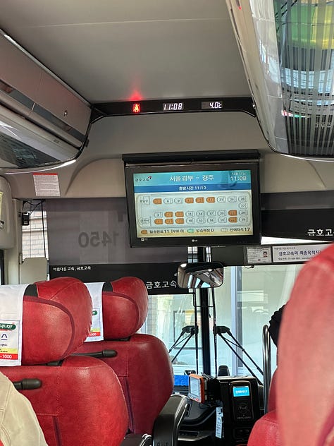 I caught the 11:15 am bus from the Express Bus Terminal. I left my hostel around 10 am and took the subway, which was just a 5-minute walk away. However, I almost ended up being late because, when I arrived at the station, I discovered it was actually an underground shopping mall! To make things more confusing, the subway line I took was divided into express and normal trains.