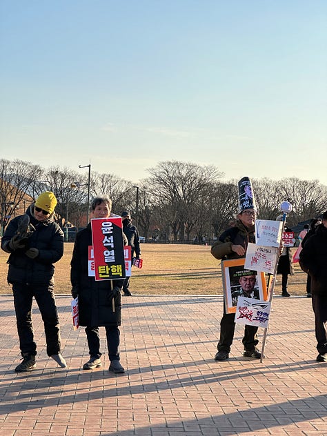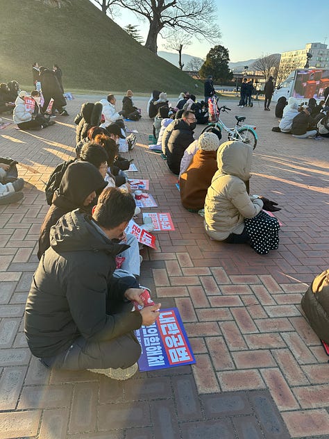 The rally felt more like a fiesta, with everyone holding K-pop light sticks that lit up the atmosphere behind the sunset. Young people were singing along with the hosts on stage, creating an electrifying energy (It’s like sitting in an open live concert!). While I was soaking in the excitement, a young man approached me, speaking in Korean, and kindly offered me a mat to sit on. I realised I had been sitting directly on the cold ground and, feeling touched by his gesture, replied, "Aneyo, Gwenchaneyo" (It's okay…) (Hahaha it really works when I picked up some Korean words through Kdramas). Despite realising I was a foreigner when I replied to them in English, they welcomed me warmly and their faces lit up with genuine excitement, even from behind their thick winter coats when I congratulate them. What a beautiful and heartwarming experience this was for me!