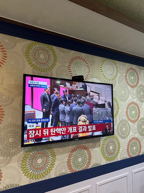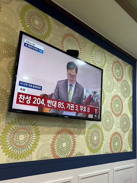 Then, I noticed a live screen showing a broadcast from the National Assembly in Seoul. “Hey, this must have something to do with an important decision about President Yoon’s status”. My instincts were right! After texting Jeong Soo to confirm, she explained that they were awaiting the results of the impeachment vote against Yoon Suk-Yeol’s presidency.